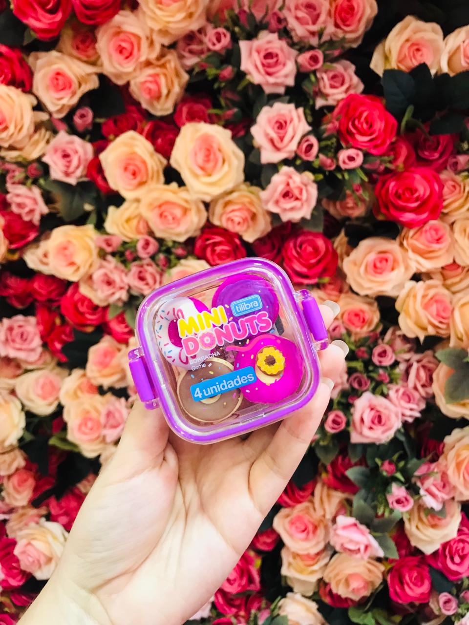 A borracha Donuts tem formato de rosquinha, com cobertura removível para personalização de sabores. O produto vem com 4 miniborrachas, em embalagem de lancheira.